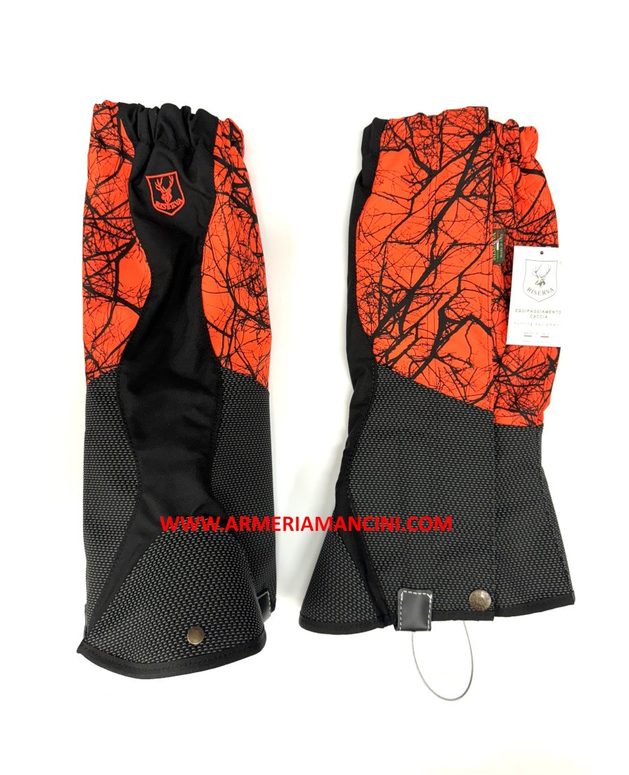Ghetta in tessuto arancio alta visibilità con effetto rami e rinforzi in Putek, un materiale ultra-resistente, antiabrasivo e protettivo.