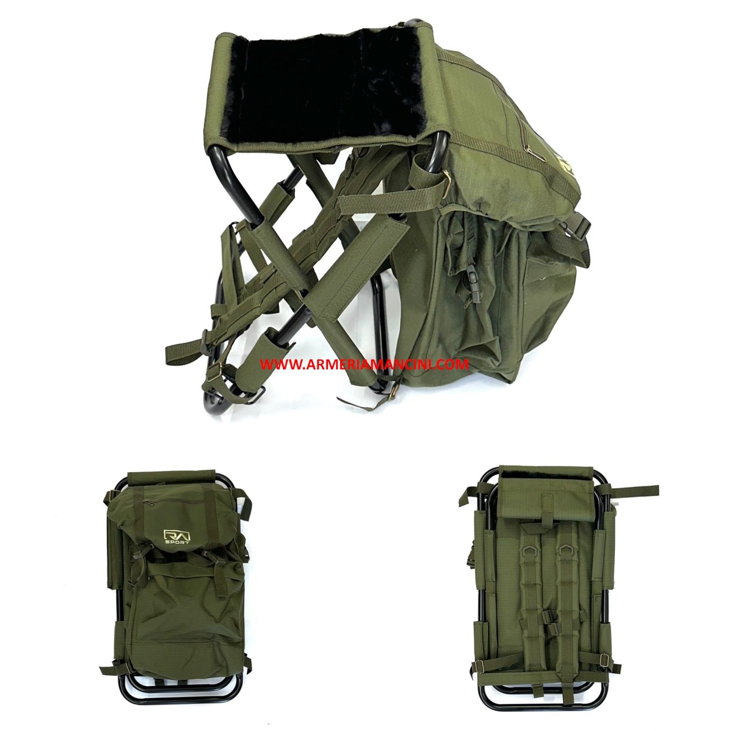 Zaino-sgabello realizzato in poliestere 600D RipStop ultraresistente.