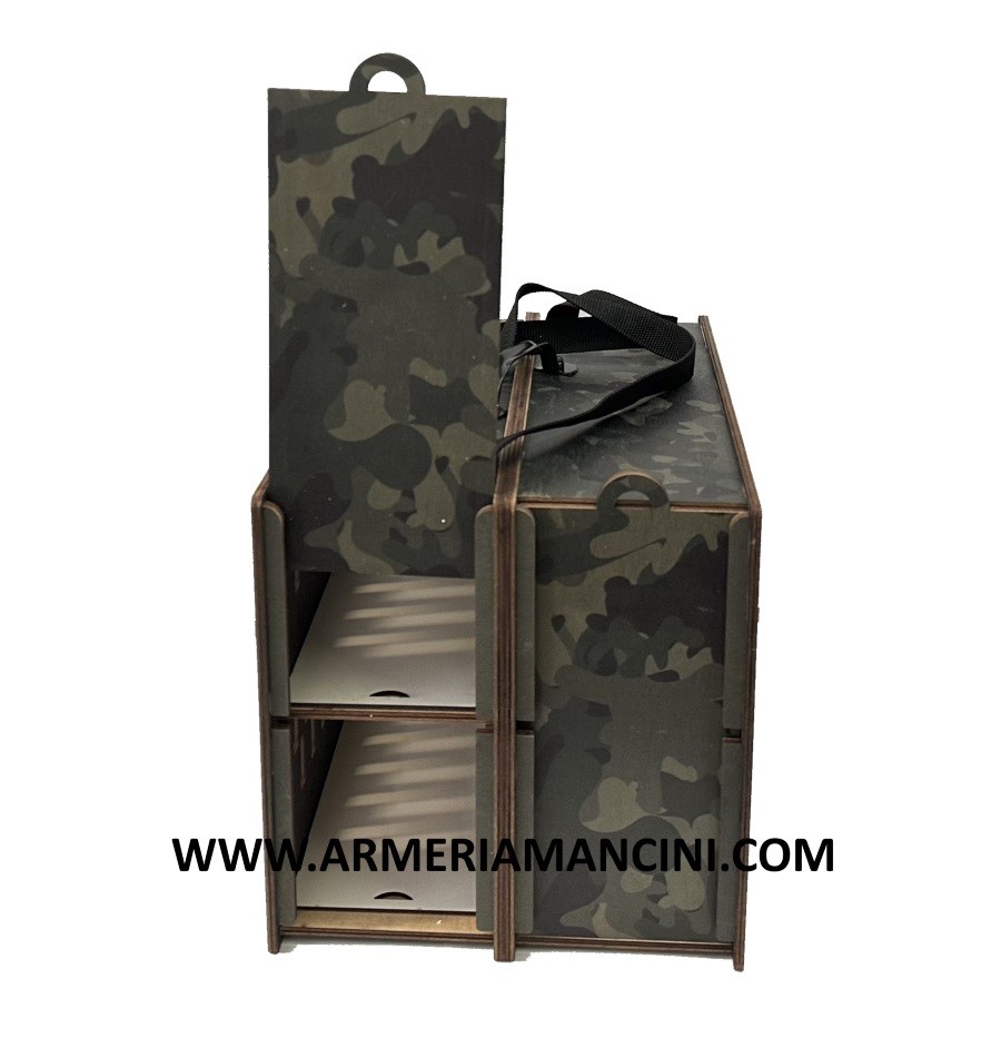 Cassetta trasporto piccioni a 4 posti con beverini, in legno naturale e finitura camouflage con tracolla e maniglia per il trasporto.